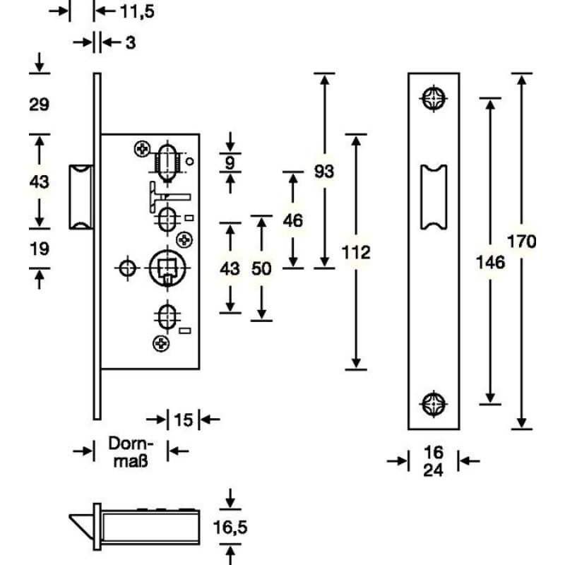 nach DIN 18251-2 · Schlosskasten aus Stahl oben und unten geschlossen · käntig · Stulp Edelstahl · Stulplänge 170 mm · Vierkant 8 mm · DIN Links / Rechts verwendbar · Falle aus Zinkdruckguss · ohne Schließblech