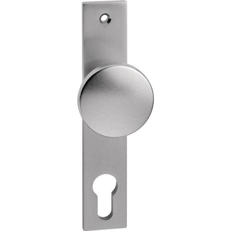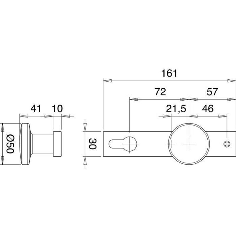 Schlosskastenkurzschild mit geradem Knopf · Entfernung 72 mm · PZ-gelocht · massives Schild · passend für alle Schlosskästen mit 8 mm Nuss · Knopf mit M-12 Gewinde · Schraublochabstand 67 mm · Stärke 10 mm · Höhe 161 mm · Breite 30 mm · sichtbare Verschraubung · DIN links / rechts · Aluminium · Lieferung ohne Stift und Schrauben