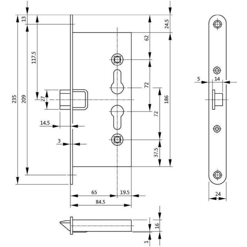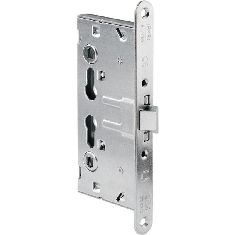 PZW Ausführung · für Feuerschutzabschlüsse T30-1 · allseitig geschlossener Schlosskasten · mit Wechsel · abgerundet · Stulp verzinkt · Falle und Riegel aus Stahl · Stulplänge 235 mm · ohne Schließblech · Vierkant 9 mm · Entfernung 72 mm