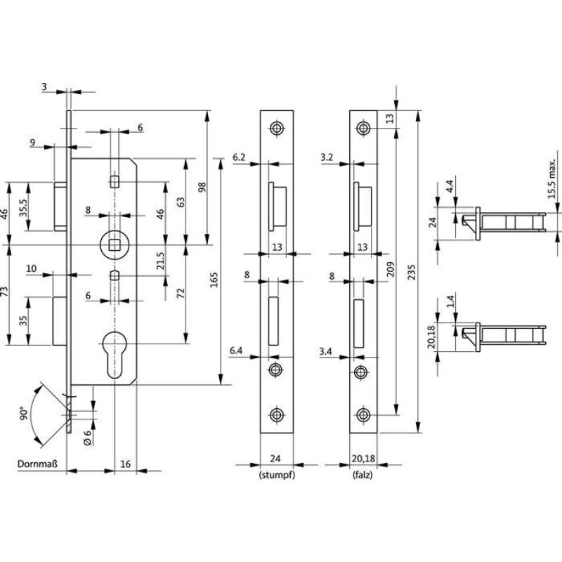 PZW Ausführung · allseitig geschlossener Schlosskasten · 1-tourig · mit Wechsel · käntig · Stulp silber · Stulplänge 235 mm · Entfernung 72 mm · Falle und Riegel aus Zinkdruckguss · ohne Schließblech