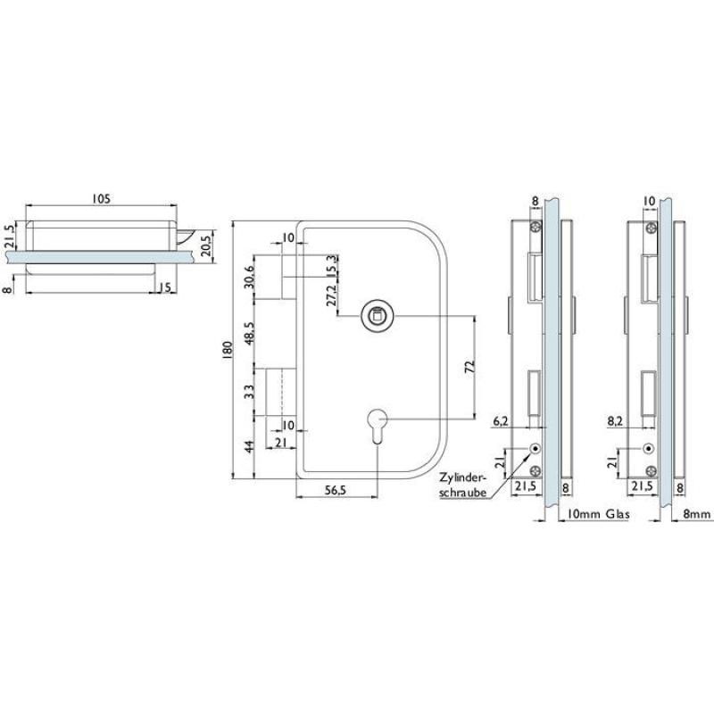 Grundschloss geprüft nach DIN EN 18251 Klasse 3 · Flüsterfalle · 2-geteilte Spezial-Klemmnuss · verschraubte Schlossabdeckungen aus Edelstahl · Zubehörbeutel mit Drückerführung 16 + 18 mm · bei diesem Schlosstyp ist die Angabe links oder rechts erforderlich · für 8 mm Glasstärke