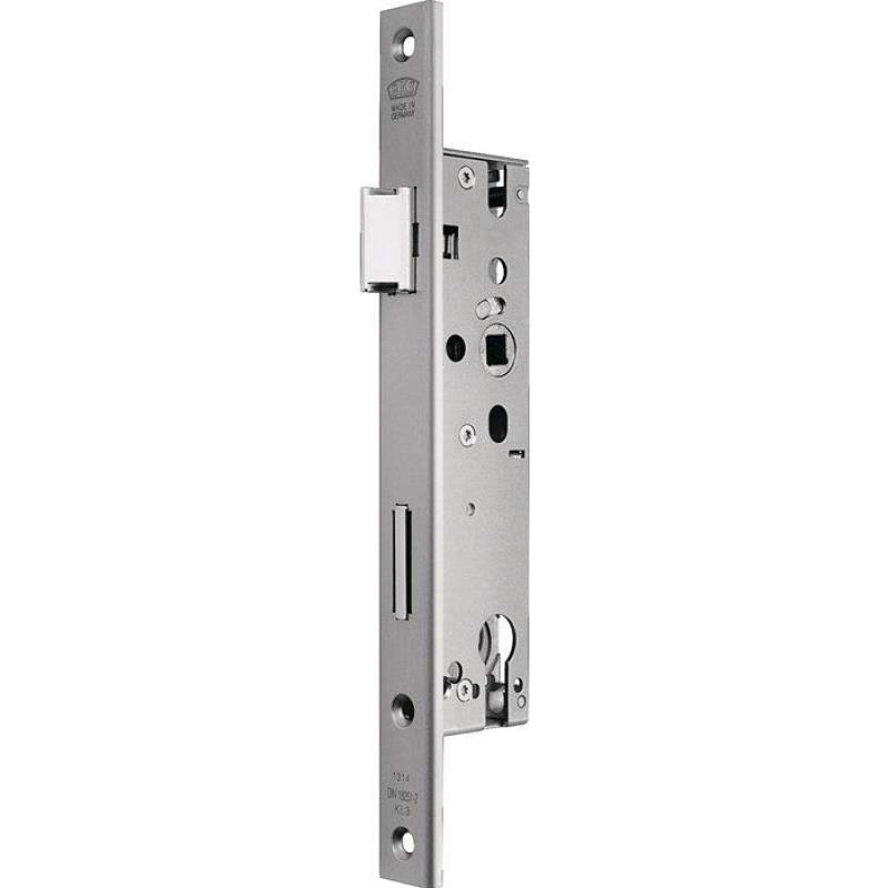 für einflügelige Türen · DIN links und rechts verwendbar durch umstellbare Falle · zugelassen nach DIN 18251-2 Klasse 3 · Falle und Riegel aus Zink-Druckguss · 20 mm Riegelausschluss, 1-tourig · Stulp Edelstahl matt · PZ · Entfernung 92 mm · 8 mm Vierkant · mit Wechsel