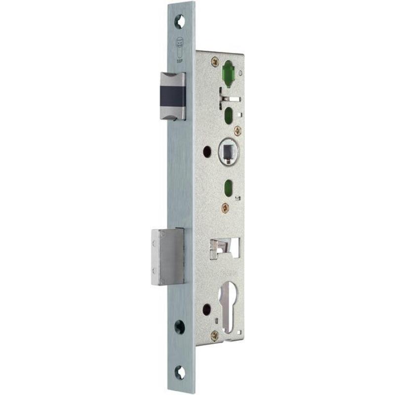 Schlosskasten aus Stahl oben und unten geschlossen · durchgehende Beschlagbohrung oberhalb der Schlossnuss · Späneschutzhülsen · 1-tourig mit stabilem Riegel · Riegelausschluss 21 mm · DIN links und rechts verwendbar · Anschlagrichtung umstellbar · vorgerichtet für Profilzylinder, mit Wechsel · Entfernung 92 mm · 8 mm Klemmnuss · Falle und Riegel vernickelt · Stulp auf Mitte · Stulplänge 245 mm · käntig · Hinterdornmaß 15 mm · Klassifizierungsschlüssel nach EN 12 209 vorhanden