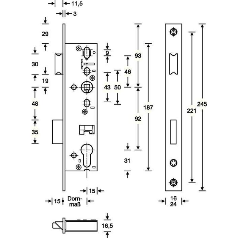 Schlosskasten aus Stahl oben und unten geschlossen · durchgehende Beschlagbohrung oberhalb der Schlossnuss · Späneschutzhülsen · 1-tourig mit stabilem Riegel · Riegelausschluss 15 mm · DIN links und rechts verwendbar · Anschlagrichtung umstellbar · vorgerichtet für Profilzylinder, mit Wechsel · Entfernung 92 mm · 8 mm Klemmnuss · Falle und Riegel vernickelt · Stulp auf Mitte · Stulplänge 245 mm · käntig · Hinterdornmaß 15 mm · Klassifizierungsschlüssel nach EN 12 209 vorhanden