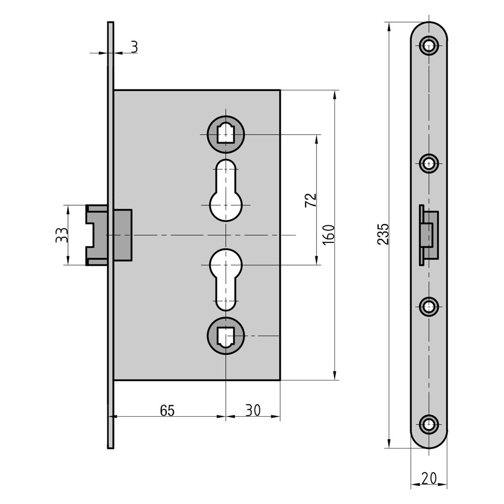 Einsteck-Sicken-Türschloss PZ, 65/72/8 mm, 20 mm abgerundet, verzinkt, DIN links/rechts