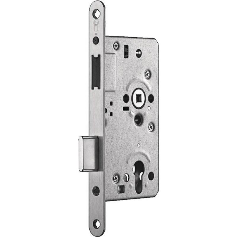Weitere technische Eigenschaften · Schlosskasten: allseitig geschlossen · passend für: stumpfe Türen · ZT-Einsteckschl.MG 50 SET · BB 20/ 55/72/8mm DIN L/R · VA rd SSF · Im Lieferumfang je nach Stulpbreite enthalten: Schließblech 4736 00/523 S MG FEV 24x200 mm Edelstahl 2- fach verstellbar oder Schließblech 4735 00/523 S MG FEV 20x200 mm Edelstahl 2- fach verstellbar ·