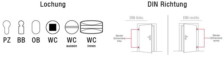 | OB = Ovale Lochung, für Zimmertür mit Buntbart Schlüssel | DIN rechts: Man steht vor der Tür, welche sich zu einem hin öffnet. Befinden sich die Türbänder rechts, spricht man von DIN rechts. |