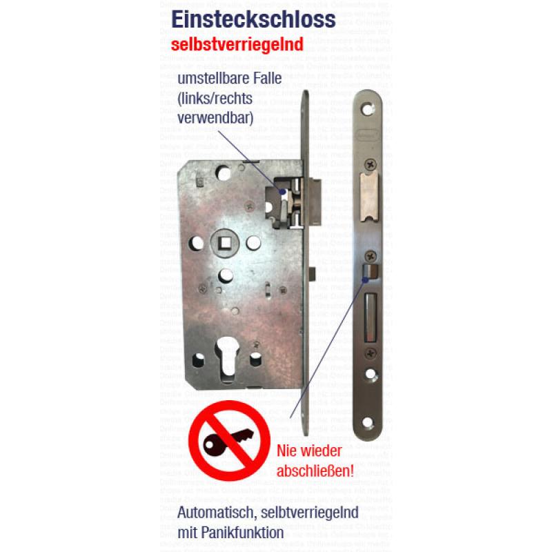 PZW Ausführung · selbstverriegelnd · allseitig geschlossener Schlosskasten · 1-tourig · mit Wechsel · abgerundeter Stulp · Edelstahl · Stulplänge 235 mm · Entfernung 72 mm · DIN links / rechts verwendbar · Falle Messing vernickelt · ohne Schließblech · keine Brandschutzzulassung Funktion: in der Grundstellung kann das Schloss von innen über den Türdrücker und von außen mit dem Schlüssel geöffnet werden (Panikfunktion E)