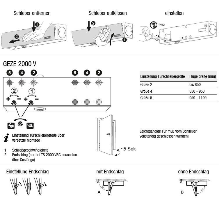 Beim Obenliegenden Türschließer TS 2000 NV mit variabler Schließkraft gemäß DIN EN 1154 ist die Schließgeschwindigkeit bequem einstellbar. Die Endschlageinstellung erfolgt über das Gestänge.